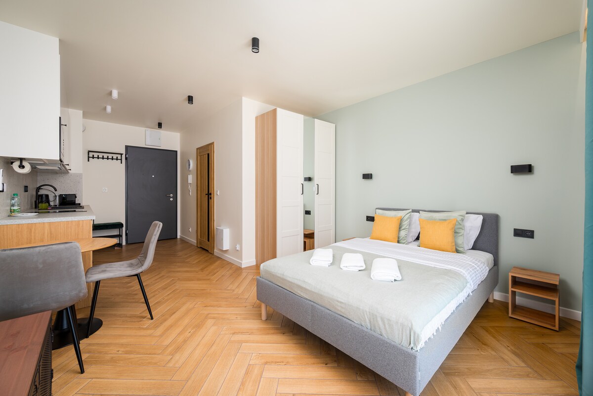 Приглашаем в современную и уютную квартиру, расположенную в Варшавском районе «Италия». Квартира расположена в современном здании, в окружении многочисленных магазинов, точек общественного транспорта (что позволяет добраться до центра за 15-20 минут) и пунктов обслуживания (тренажерный зал, пекарня, массажный салон и т. д.). Не далеко от квартиры также есть торговый центр «Факторы» и Парк Комбатантов. Идеальное место для короткого и длительного проживания, предлагающее комфорт и удобное расположение.