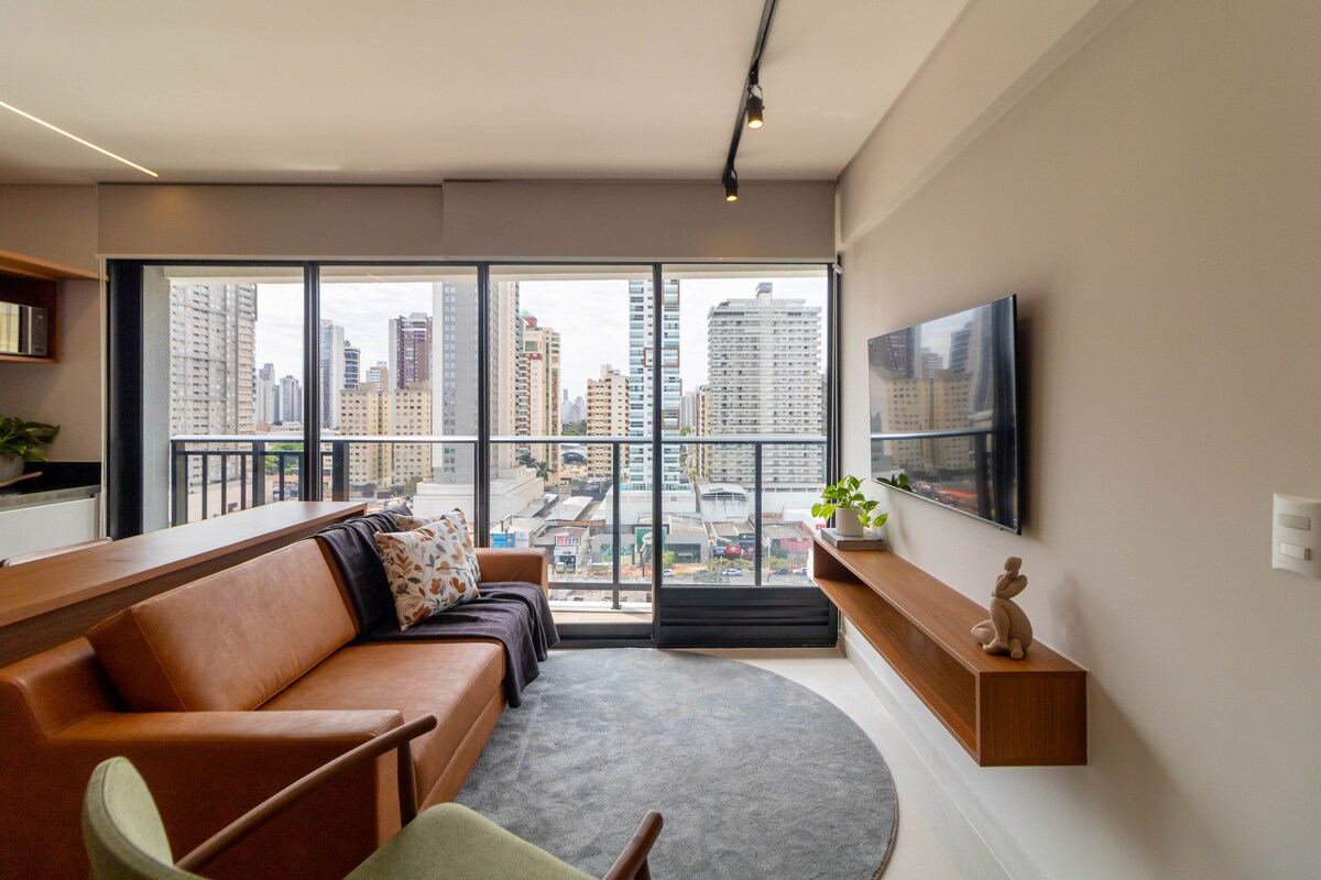 Уютная квартира, меблированная и оформленная, прекрасное месторасположение. Насладитесь элегантными, высококлассными впечатлениями. В Гоянии панорамный вид на город , высокий этаж и с частным гаражом, для тех, кто хочет уединения и комфорта, лучшая выгода для проживания, быстрая помощь, прямые отношения с владельцем. У нас есть товары, которые можно купить с оплатой через PIX или QRCode. Лучшее в компактном пребывании. Приезжайте в наш город и остановитесь в Flat.Gyn.