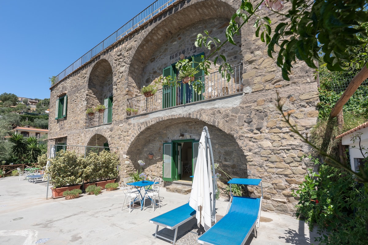 Агрополи, ворота в Чиленто, отдельная входная квартира, полностью оборудованная кухня, в 60 метрах от моря в зеленом, вид на виллу с видом на море в востребованном районе, в 300 метрах от исторического центра через Армандо Диас 63, 1 спальня с двуспальной кроватью, гостиная с кухней и двуспальным диваном-кроватью, ванная, кондиционер, кондиционер, стиральная машина, стиральная машина, телевизор, телевизор, Wi-Fi, Wi-Fi 336 Мбит/с Рядом 2 пляжа (60, 150 метров), все магазины в 300 м. И старинная деревня с замком, центр культурной и художественной деятельности (400 м)
