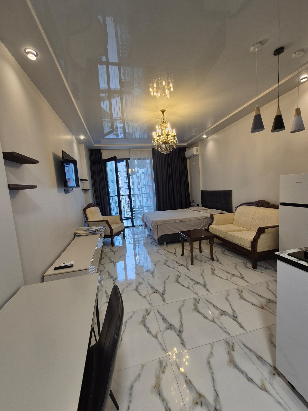 Современная просторная студия премиум класса на 17 этаже с потрясающим видом на море, парк, горы и бассейн. В апартаменте есть всё необходимое для комфортного проживания: посудомоечная машина, капсульная кофеварка, стиральная машина, тостер, микроволновая печь и т.д. Апартамент находится в лучшем комплекса в Батуми с большой территорией, бассейном, спортивной и детской площадкой во дворе, ресторанами и магазином. Рядом торговый центр, казино, море и парк. До аэропорта 5 минут на такси.