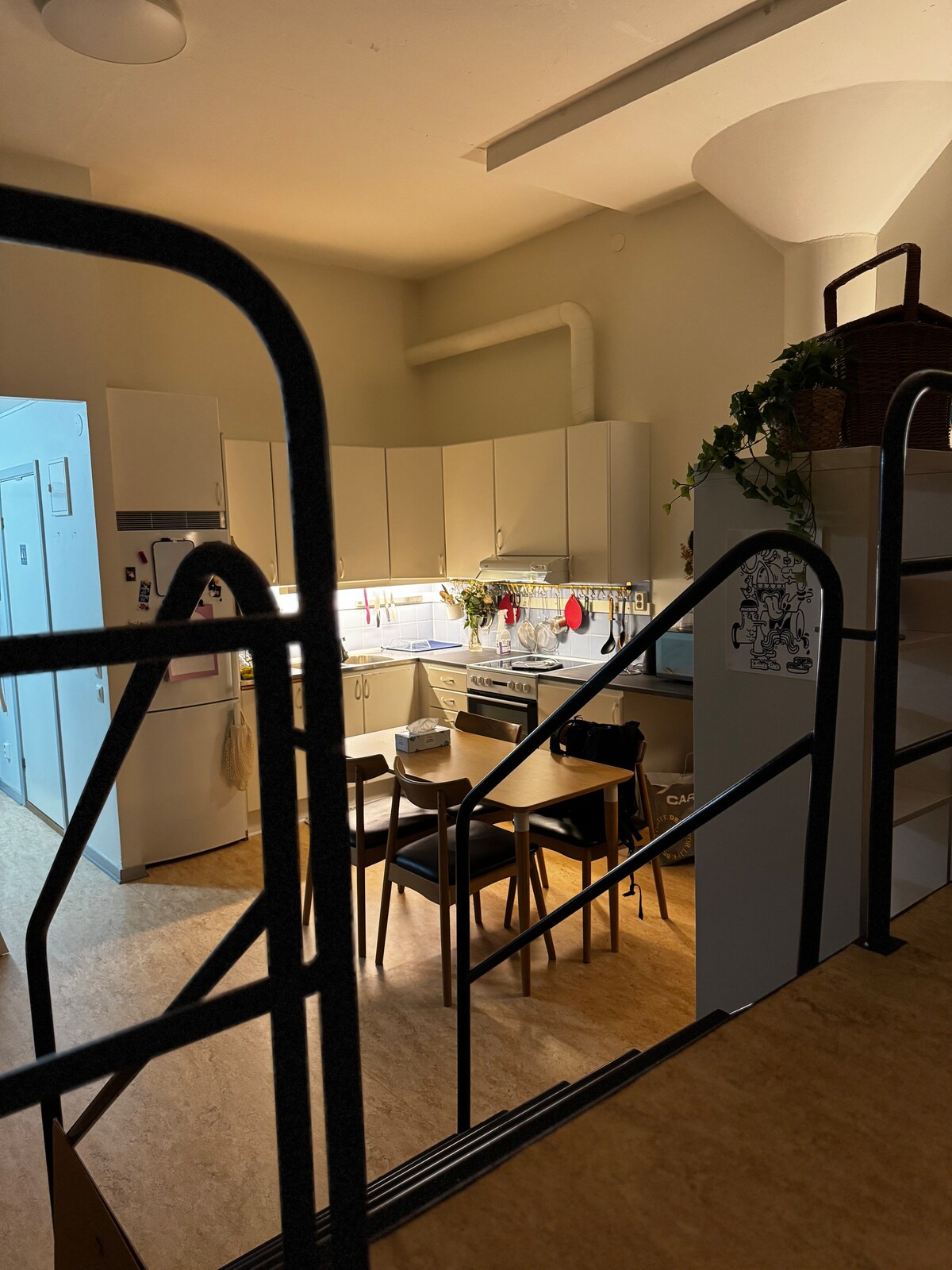 Квартира расположена на первом этаже, небольшая лестница до входа, семь ступенек. Кухня просторная и оборудована самыми основными кухонными принадлежностями для приготовления простых блюд, посудомоечной машиной и микроволновой печью. Кухонный стол и четыре стула. Спальня: двуспальная кровать 180 см, стул, письменный стол, два табурета, шкафы, напольное зеркало, комод. Гостиная: диван, стол, кресло, шкаф, скамейка для телевизора, телевизор. Кровать 140 см. Маленький холл с крючками. Туалет, душ и шкаф в ванной комнате. Фен. Надувной матрас предоставляется в качестве дополнительной кровати, заполненной через розетку.