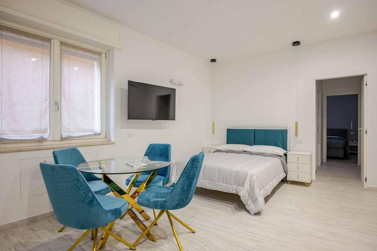 шкаф лары площадью около 90 квадратных метров, полученный из больших конюшен 1700 и отличается уникальной средой с 2 оригинальными мраморными колоннами со сводчатыми потолками. В том же помещении есть гостиная, кухня и спальня в идеальной гармонии. Рядом с кухней есть зеркальная дверь, которая обеспечивает доступ к ванной комнате в старой башне рядом со студией. Стены были обработаны, чтобы сохранить аутентичный вид исторического пространства.