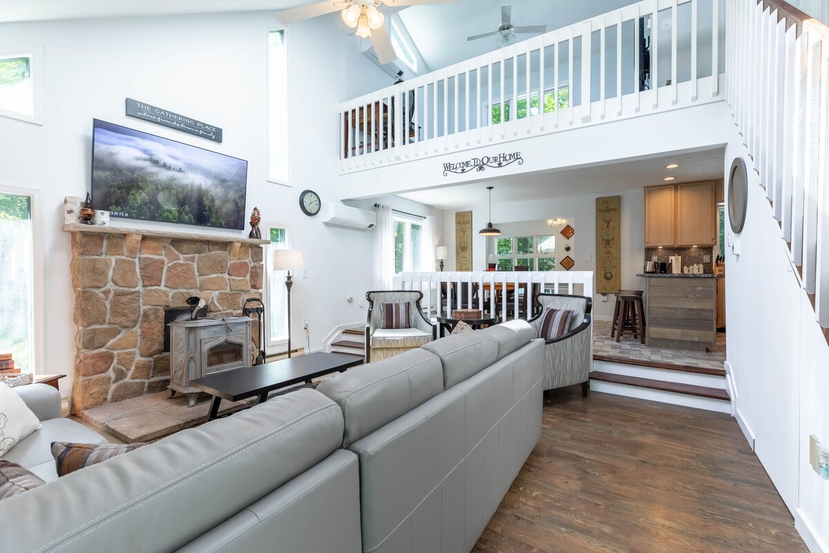 Сводчатые потолки, камин в гостиной, 2 спальни на первом этаже в этом просторном и частном 4-сезонном домике с легким доступом к удобствам в этом районе. Дом находится в нескольких минутах ходьбы от крытого бассейна (с Дня труда до Дня поминовения) и всего в нескольких минутах ходьбы от красивого государственного парка площадью более 2000 акров, чтобы исследовать с тропами и песчаным пляжем площадью 250 акров озера. Открытый бассейн, пляжи, теннисные корты и многое другое открыты со Дня поминовения по День труда. 3 горнолыжных склона находятся менее чем в 30 минутах езды.