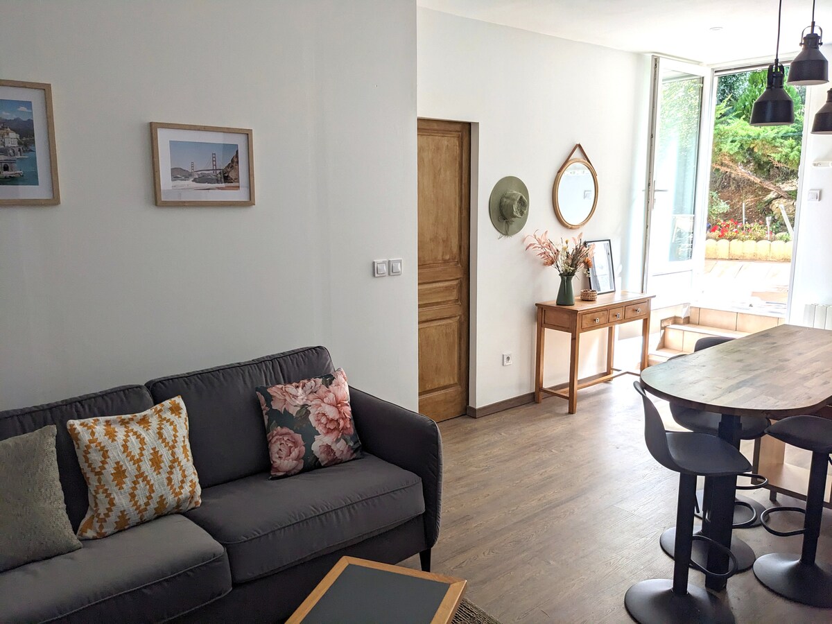Монпелье, Les Hauts de Massane en Occitanie. Очень красивая студия, полностью оборудованная, отдельная и тихая, в нашем доме (основное место жительства, в котором мы живем круглый год), окруженная садом с террасой и бассейном над землей. Тщательно сделанная, современная и оформленная с трезвостью (скандинавский декор), она полностью оборудована, кондиционирована и находится недалеко от университетов (трамвай и автобус), а также магазинов. Мы находимся в 30 минутах езды от моря (Палава-ле-Фло).