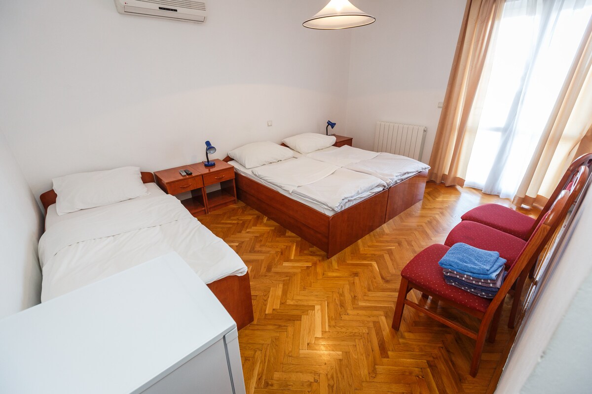 Наши трехместные номера оснащены: телевизором, холодильником, международными программами, балконом, кондиционером, WiFi, ванной комнатой и т.д. Вас также ждет прекрасный вид на горы Козяк и захватывающий вид на море.