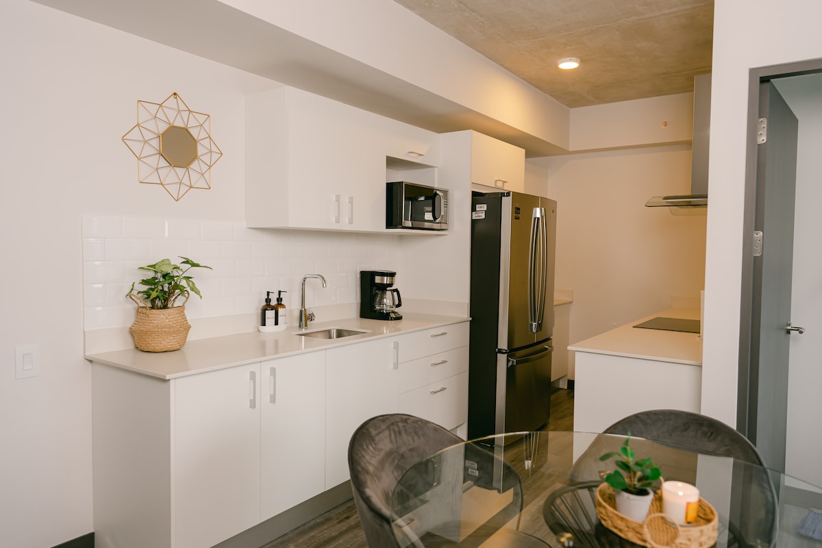 Утренняя прогулка по парку, прежде чем вернуться в индустриальную квартиру с 2 спальнями, расположенную в центре города, которая встретит вас высокоскоростным Wi-Fi, первоклассной кухонной техникой, удивительным декором, удобными кроватями и видом на закат с 12-го этажа с видом на город. Мало того, что у вас будет доступ к непревзойденным удобствам, таким как полуолимпийский бассейн, сауны, тренажерный зал и коворкинг, вы будете в нескольких минутах ходьбы от лучших ресторанов, кофеен и продуктовых магазинов города.