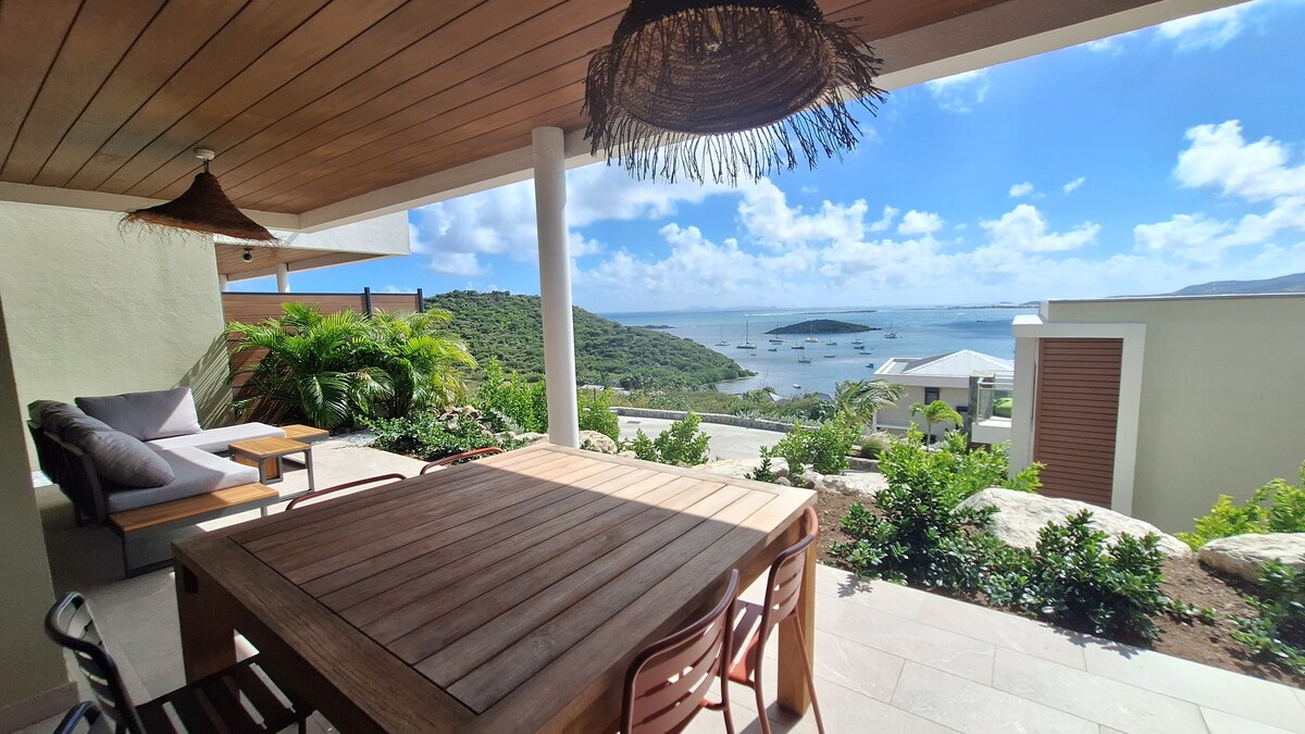 Это самый красивый вид во всем Ориент-Бей! Великолепная панорама на весь пляж Ориент-Бей, острова Сен-Бартс, Тантамар и часть острова Пинель. По-настоящему уникальное Впечатление. Квартира полностью отремонтирована: 2 отдельные спальни (без общих стен = идеальная уединенность для двух пар), кровати размера King size, 2 ванные комнаты, 2 туалета. Мезонин с односпальной кроватью (90×200). Полностью оборудованная кухня. Тройная экспозиция = естественная вентиляция. Прямой доступ к пляжу Ориент-Бэй.