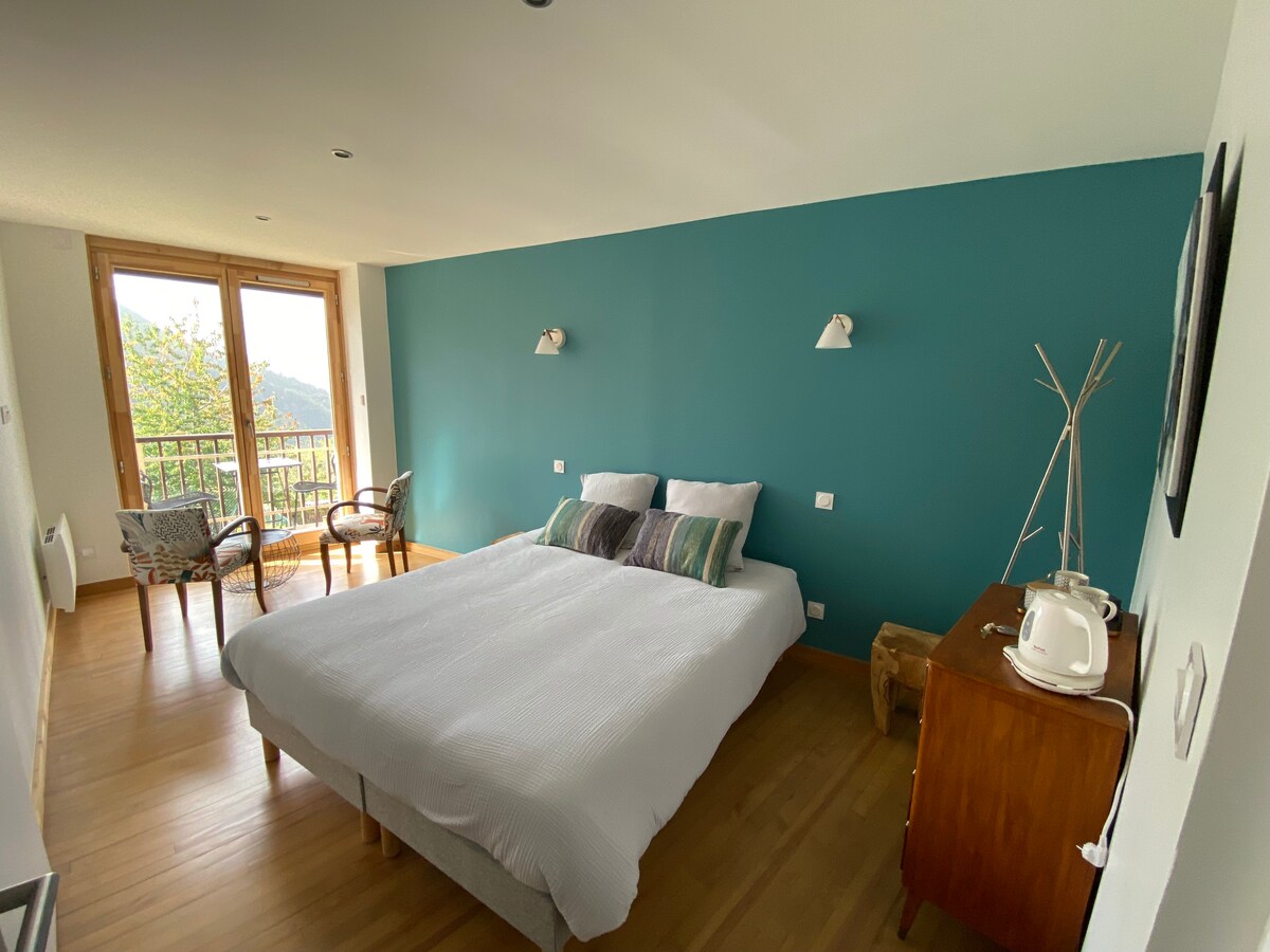 Хотите отдохнуть на природе? Отдохните в гостинице Santon Bed & Breakfast. Район спокойствия в центре природы, менее чем в 20 минутах от Гренобля. В духе семейного дома мы приглашаем вас на выходные или отдохнуть, чтобы подзарядиться энергией и отключиться. Люкс площадью 50 м², включая спальню (кровать 140), ванную комнату с ванной и отдельную библиотеку, оборудованную мини-холодильником, Nespresso, чайником и микроволновой печью.