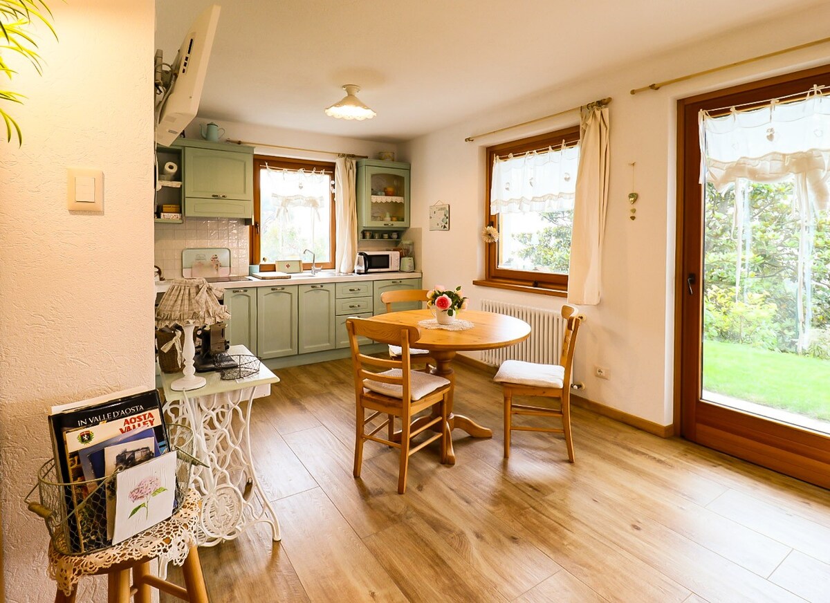 Альпы. Италия. Долина Аоста. Хижина в маленькой деревне в 1600 метрах,в тишине лугов, пасущихся коров и гор. Снег (обычно) зимой. Место сердца, с любовью восстановленное с сохранением древних балок крыши. Прекрасный вид из больших окон и особое спокойствие для тех, кто в поисках мира, тепла и релаксации. Мебель очень красивая: дерево прежде всего, но и более живые цвета, и современные удобства. Тихие экскурсии, как на снегоступах, так и на лыжах.
