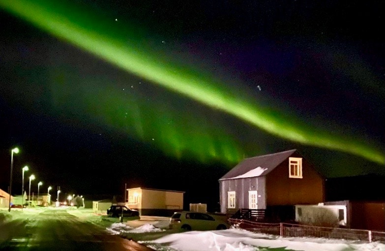 Vellir is a historic home in the village of Grenivík, North Iceland, with uninterrupted views across the fjord. Just a 25-minute scenic drive from Akureyri, Grenivík is a special place beneath Kaldbakur Mountain, known in folklore as a powerful energy source. The house is 80 m² across three floors. The evening sun creates spectacular sunsets, and during winter guests can often see the Northern Lights from the living room. Whales are regularly spotted year-round just outside the window.