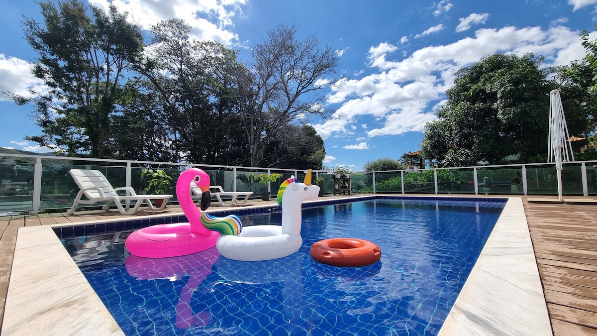 Ideal para grupos grandes! Casa para até 16 pessoas com excelente custo por pessoa, perfeita para famílias e amigos. Vista incrível para as montanhas, PISCINA | SALA DE JOGOS | SAUNA | HIDROMASSAGEM | QUADRA PARA ESPORTES. Localizada no Morro do Chapéu, a 20 min do centro de Capitólio e 30min do Local de passeios de lancha. Cozinha completa e conforto total. Há uma caseira que reside em uma casa ao lado. 💰 Ótimo custo-benefício! Dividindo entre os hóspedes, o valor por pessoa fica excelente!