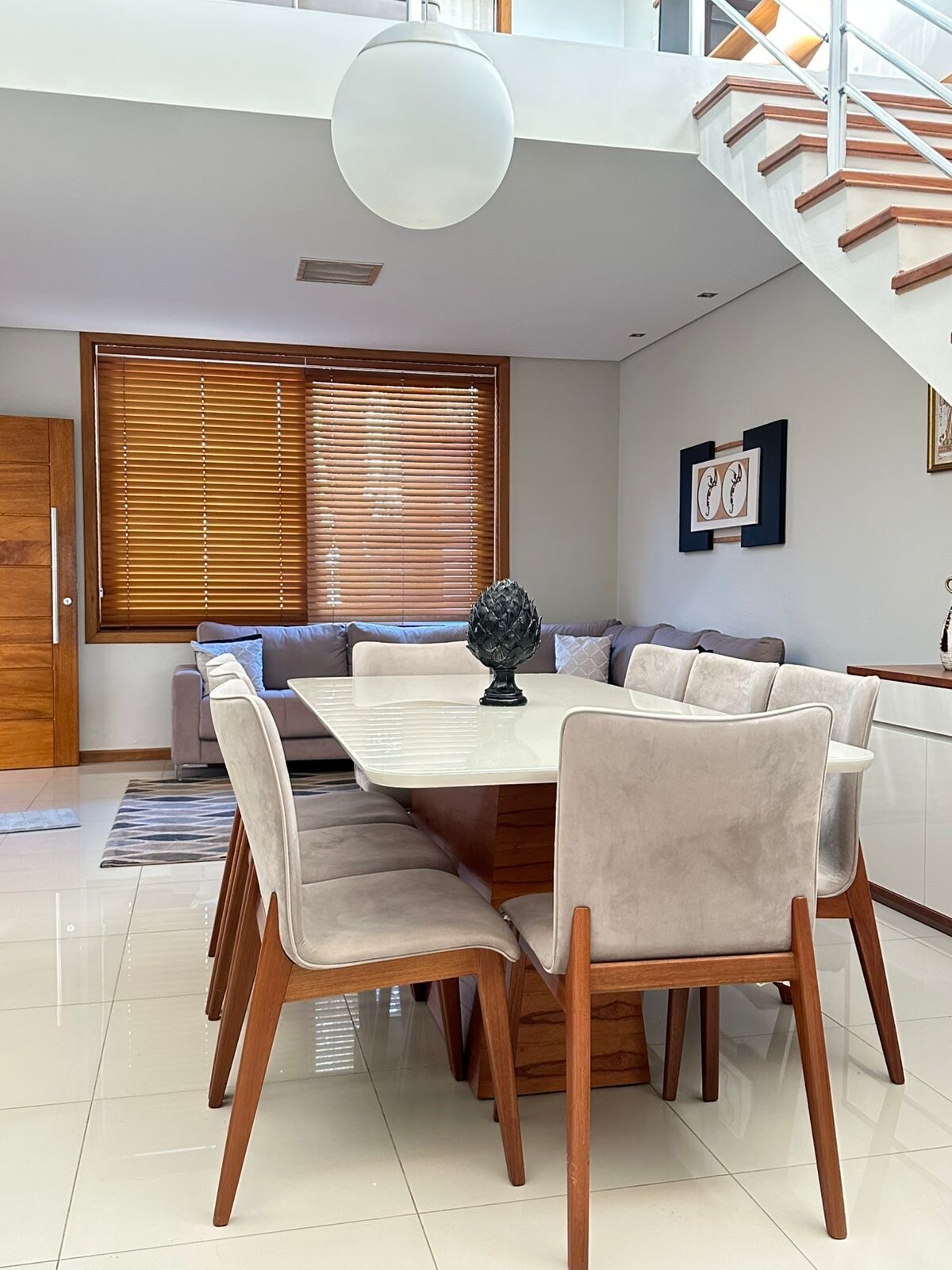 2 ванные комнаты и мезонин для 6 гостей. Кондиционер, SmartTV. Полностью оборудованная американская кухня, балкон с гамаком и барбекю. Просторный газон и парковка на 4 машины. Частный бассейн 4X3 м, с шезлонгами, столами, стульями и солнцем для еды на открытом воздухе. Защищенный бассейн для безопасности детей и домашних животных. Плата 250,00 R$ за 2 домашних животных. Возможны перебои в работе Интернета, перебои в подаче электроэнергии, шум от строительства и других видов деятельности в районе.