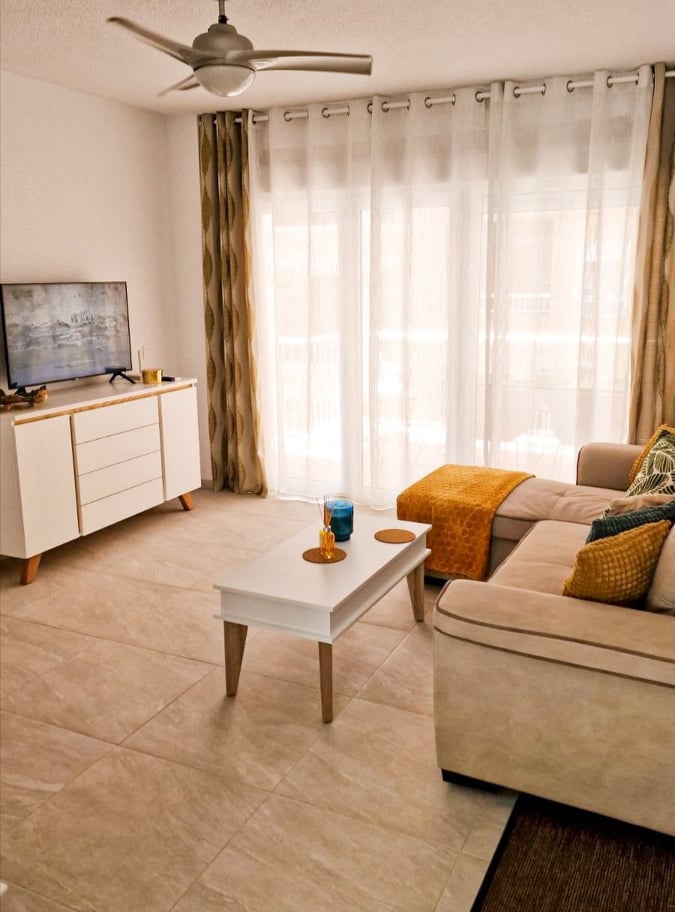 We offer a freshly renovated apartment located in the beautiful, family-friendly town of Guardamar del Segura. This peaceful seaside town is just a short drive from city of Torrevieja and only 30 km from Alicante Airport — about 40 minutes by car, with easy and convenient access *Central location *Two separate bedrooms, each with brand-new double beds and high-quality mattresses *All windows and the balcony overlook pedestrian promenade lined with palm trees and flowers and evening sunlight