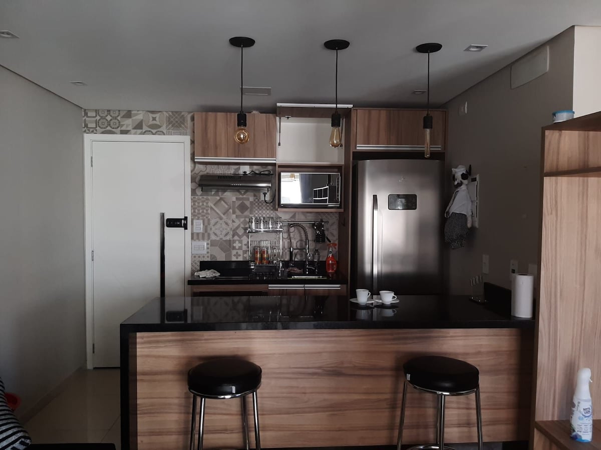 Отличная студия в Гуарулхосе! Прямо в пути из Дутры. Расположена в центре Гуарульхоса, в 15 минутах от аэропорта и в 25 минутах от Сан-Паулу. В студии есть полностью оборудованная кухня, а также кофемашина Nespresso, блендер и фильтр. Также есть домашний офис, чтобы вы могли работать спокойно. В спальне есть гардероб, двуспальная кровать размера Queen size и весь триссо. Новое здание с парковкой, бассейном, фитнес-центром, прачечной, конференц-залом и круглосуточным консьержем.