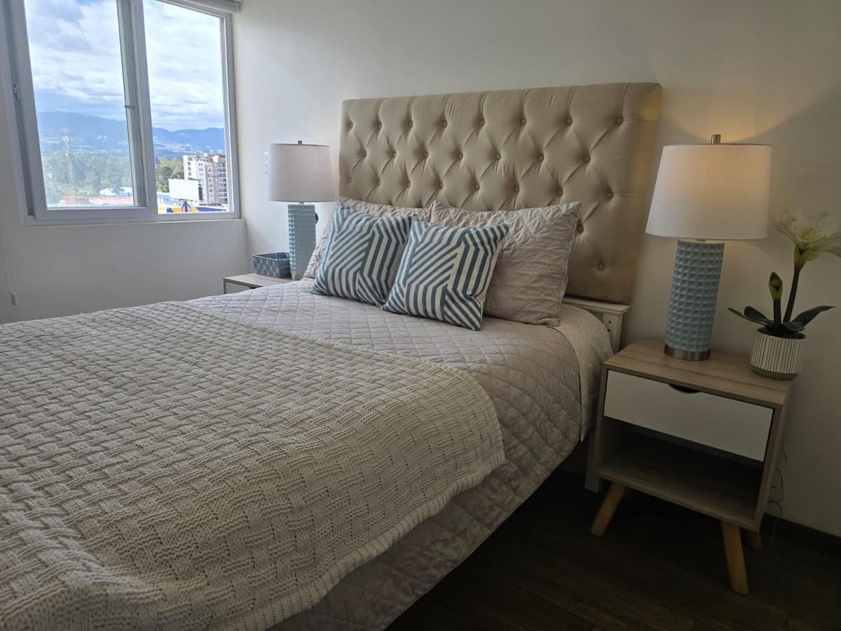 Apartment with excellent location, less than 1km from Paseo Cayalá, Spazio, Universidad Del Valle and Landivar, 20 minutes walk from the United States Embassy or 5 minutes by car. This apartment has what you need for a short stay or a longer stay, it has views of the city, fresh spaces as it has floor-to-ceiling windows. Washing machine, Refrigerator, Coffee maker, Dishes, Cutlery, microwave,two full bathrooms, room with a king bed and a sofa bed in the second room.