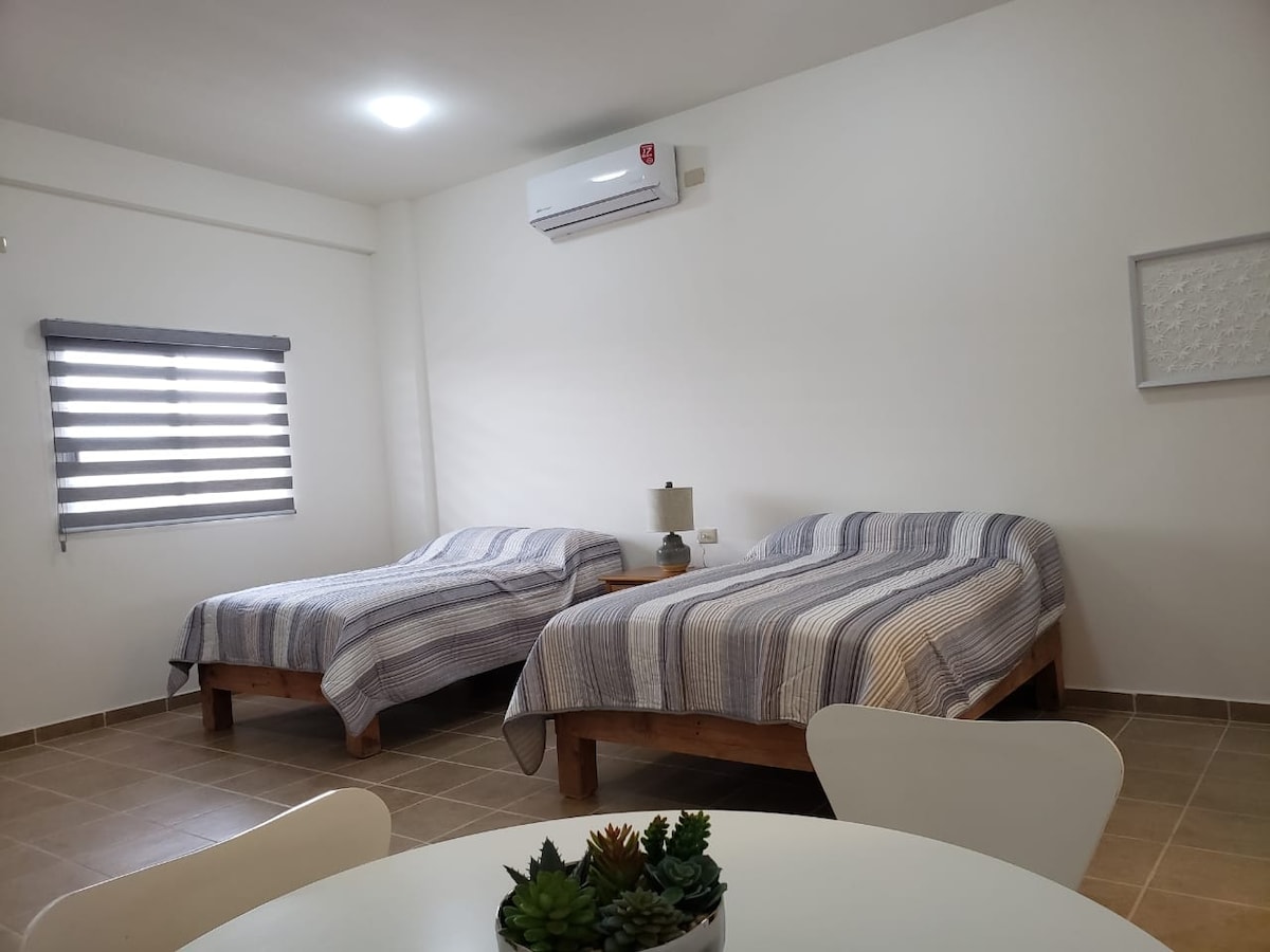 Совершенно новая квартира, их семья будет близко ко всему, если вы остановитесь в этом центрально расположенном месте. Квартира расположена в центре Гуаймаса, в двух кварталах от пирса, в 10 минутах от пляжа Мирамар и в 20 минутах от Сан-Карлоса. Для вашего спокойствия и безопасности мы закрыли контур в частном (камеры наблюдения), электрические ворота с закрытым гаражом для вашего автомобиля.