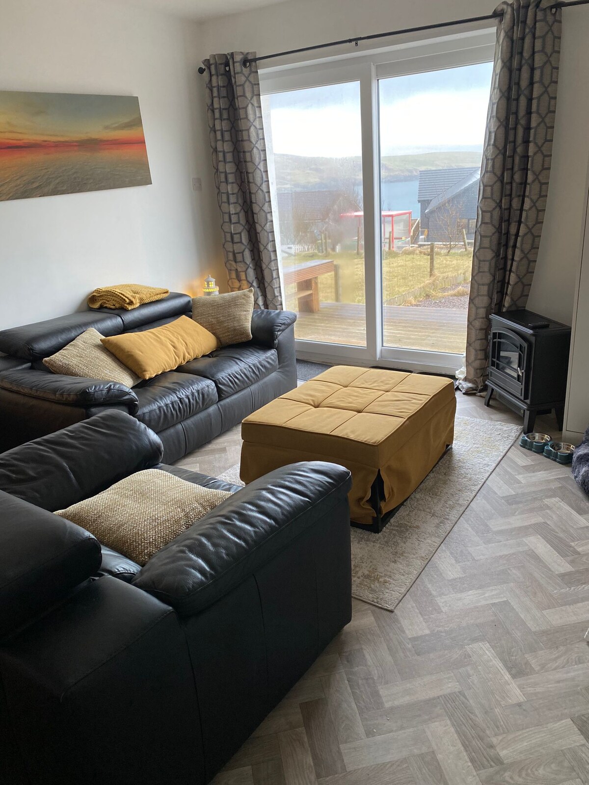Жилье расположено на склоне холма с потрясающим видом на море и закат на западе Шетландских островов, включая Фулу и Скаллавей. Современная квартира-студия на первом этаже с роскошным диваном-кроватью, детской кроваткой или раскладушкой для младенца или ребенка (постельное белье), мини-кухней (холодильник/морозильная камера, чайник, тостер, микроволновая печь), ванной комнатой (полотенца), телевизором со smart-TV, бесплатным Wi-Fi. Двери патио ведут на террасу и в прекрасный сад. Парковка. Пять минут езды до красивого пляжа Мил, 10 минут до Лервика. До Скаллавея можно дойти пешком. На автобусном маршруте.
