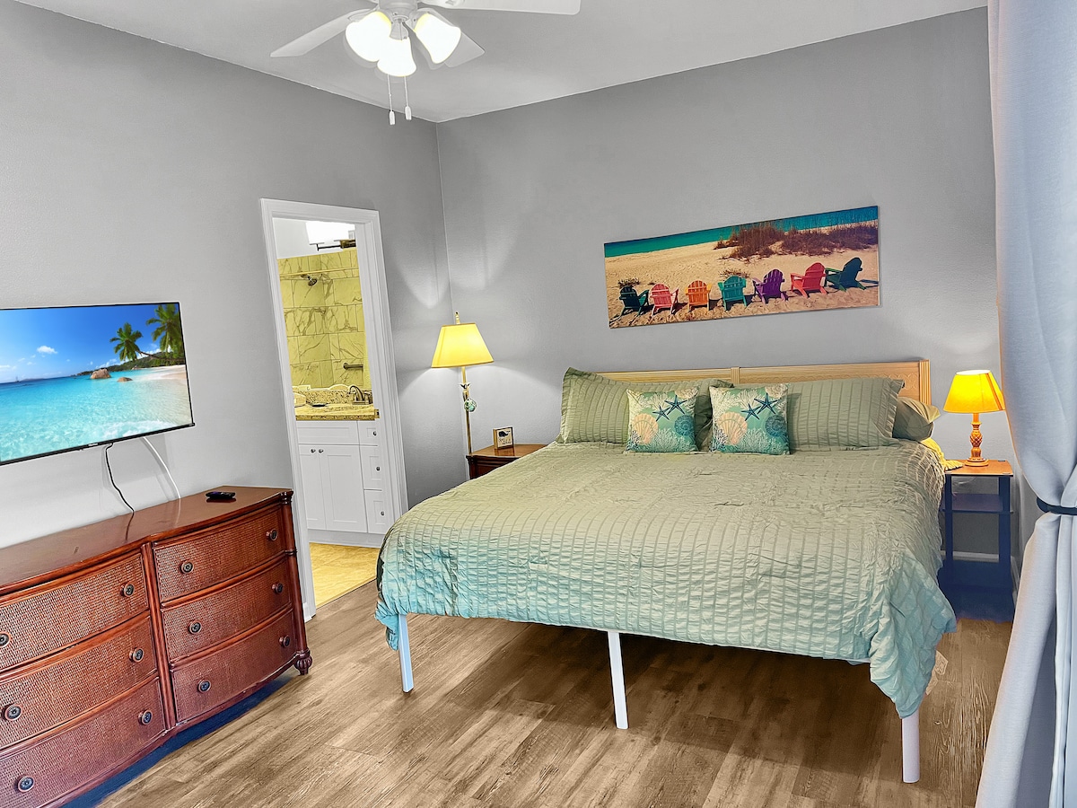 Расположена в центре. Эта квартира на ПЕРВОМ ЭТАЖЕ находится на углу здания. Единственный общий сосед - тот, что над вами. Мы находимся в 1,7 милях от пляжа. Вмещает до 6 человек, но только 4 ВЗРОСЛЫХ с 2 двуспальными кроватями размера King size и двуспальной кроватью с выдвижной кроватью. В спальнях есть смежные ванные комнаты. 58-дюймовый телевизор Roku в гостиной и 40-дюймовые телевизоры Roku в каждой спальне. Хорошо оборудованная кухня со всем, что вам может понадобиться для вашего удобства. Шампунь и мыло - это стартовые пакеты. Мы не разрешаем использовать диваны в качестве кроватей.