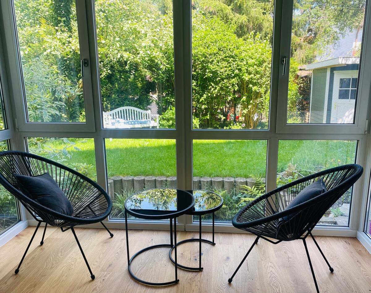Наш очаровательный отдельный дом и сад для вашего собственного использования на окраине Мюнхена. Три спальни, кухня, столовая, большая гостиная, две ванные комнаты, дополнительная душевая комната. Она вмещает пять человек, и мы можем предложить два дополнительных временных матраса для гостей.