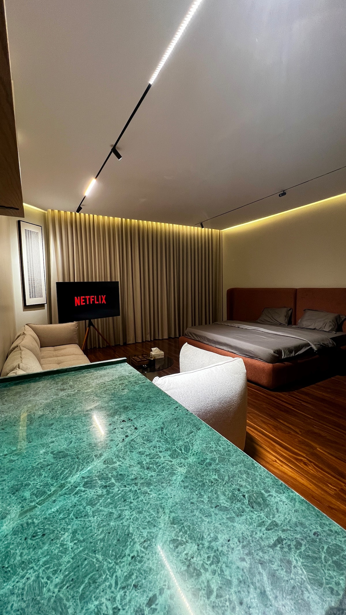 استديو أنيق ومؤثث بالكامل بتصميم عصري وهادئ، يوفر تجربة سكن مريحة ومناسبة . يحتوي على سرير مريح تم اختياره ليناسب ذائقة عملائنا، شاشة ذكية من LG باحدث اصداراتها، جلسة أنيقة، كورنر قهوة مجهز بجميع الاحتياجات. الإضاءة هادئة والتشطيب راقٍ، مع توفر إنترنت . الموقع مركزي وقريب من الخدمات، ومناسب للأفراد أو الأزواج