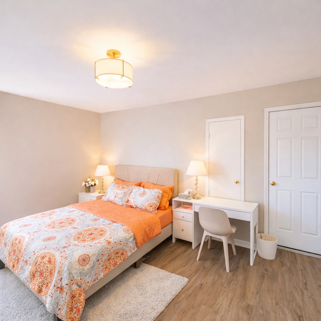 Светлая спальня с кроватью размера Queen size рядом с метро и ресторанами
