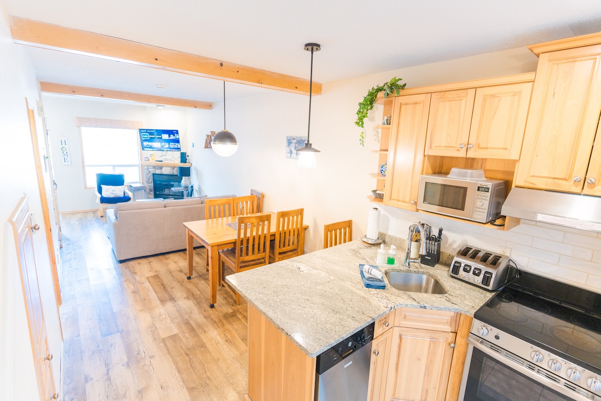 Наша 2 кровати, 2 ванные комнаты - идеальное сочетание комфорта и стиля и есть все необходимое для отдыха в Скалистых горах с семьей или с друзьями. С удобными кроватями, полностью укомплектованной кухней, новой техникой и 3 телевизорами у вас будет все необходимое для отдыха у камина после дня знакомства, катания на лыжах или сноуборде. Мы находимся в Харви-Хайтс, рядом с воротами национального парка Банф и в 5 минутах от Канмора.