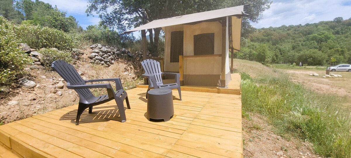 Tente lodge sur une grande terrasse en bois au milieu des oliviers A l’intérieur 2 chambres une de 14 m2 avec un lit en 140 ,l'autre avec 2 lits en 90.A l’extérieur un auvent de 10m2 pour le coin repas ,une cuisine d'été équipée, une sdb avec douche et vasque,un wc séparé. accés privatif à la rivière à 400 m en contrebas. A proximité de l oliveraie les chalanches de Piana,la forêt d'Aitone ,la reserve de Scandola.Le village d'Ota se trouve à 500 m