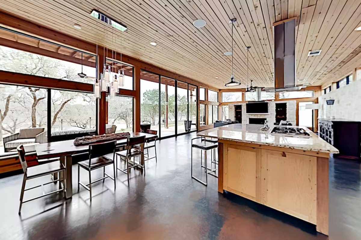 Красивый дом «Hill Country Modern» на пяти акрах с видом на наш сезонный пруд и долину. В нашем доме есть жилое пространство на открытом воздухе, в отличие от любого другого. Патио и бризвей являются частью полезного пространства. С одной стороны от дома Sunrise House есть большая гостиная с камином и огромными окнами. В доме современные светильники и отделка, сочетание новой и тщательно подобранной мебели и декора, а также красивые произведения искусства на заказ.