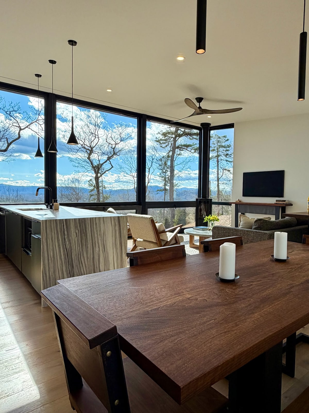 It’s hard to tell where the sky and mountains end and where Villa Nirvana (Heaven) begins in this Mid Century house, composed for serene modern mountain living. Perched at 3000 ft. on an acre of untouched woodlands, Villa Nirvana harmonizes with vibrant nature and the infinite sky outside, with flowing hickory floors, translucent sky blue walls, and sleek wood furniture. Ensconced in an oasis of sophisticated style, gaze at a long range view of the Blue Ridge and Smoky Mountains.