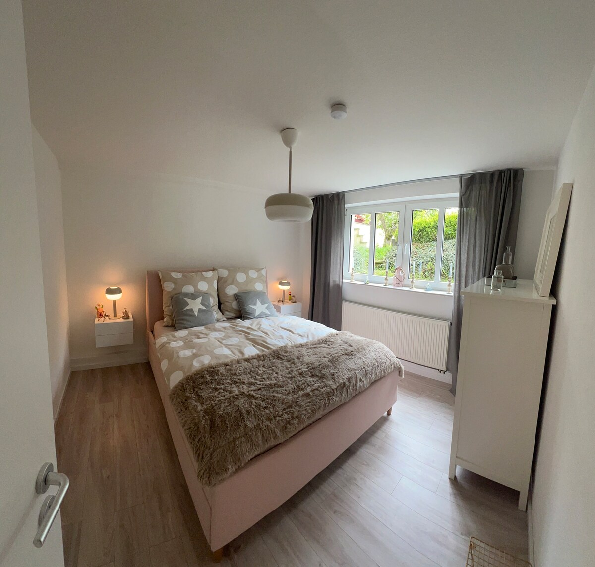 Willkommen in unserem liebevoll eingerichteten Gästehaus im schönen Detmolder Ortsteil Hiddesen – ideal für Naturfreunde, Kulturbegeisterte und Erholungssuchende! Das Haus bietet mit einem Schlafzimmer mit Doppelbett sowie einer zusätzlichen großen Schlafcouch im Wohnbereich Platz für bis zu vier Personen. Genießen Sie Ihren Kaffee auf der Terrasse mit Blick ins Grüne oder starten Sie direkt vor der Haustür zu Wander- und Radwegen im idyllischen Detmold und Lipperland.
