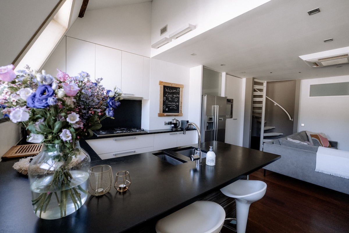 Уникальное жилье в Льеже Мы предлагаем в аренду яркий лофт площадью 150 м² на двух этажах, расположенный в центре Льежа, тихий, в месте, купающемся в зелени рядом с парком Парк Бовери и его новым художественным музеем. К услугам гостей большая гостиная зона с открытой кухней на первом этаже, две спальни с двуспальными кроватями наверху с двумя ванными комнатами и всем оборудованием для комфорта. Идеально подходит для пар и тех, кто приехал в командировку.
