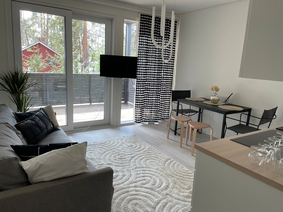 Новая квартира в лучшем месте в Тиккуриле. Всего в 250 метрах от железнодорожного вокзала Тиккурила. Поездка до центра Хельсинки займет 15 минут, а до аэропорта - 10 минут. В окружении супермаркетов, кофейни, ресторанов и т. д. Бесплатный Wi-Fi Капсульная кофеварка с бесплатным кофе. Полностью оборудованная кухня. Светильники с возможностью затемнения. Современная и стильная студия с всем необходимым.
