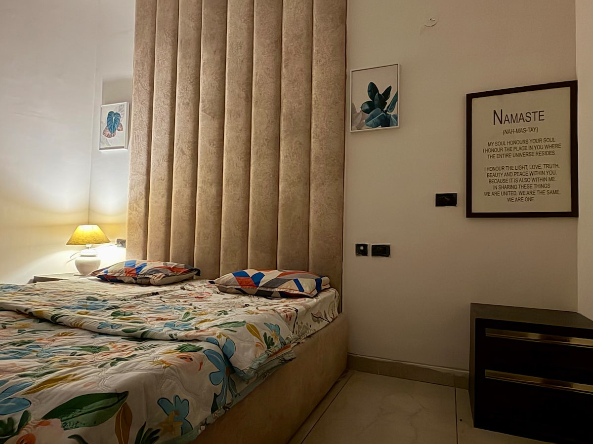 О жилье: ✨ Главная спальня. К услугам гостей двуспальная кровать размера Super King size с роскошным матрасом Sleepwell (стоимостью 1,3 ₹) для непревзойденного комфорта, 3-местным плюшевым диваном, сплитным кондиционером, умным потолочным вентилятором, 65-дюймовым телевизором Android QLED с звуковой панелью JBL, примыкающей ванной комнатой и продуманным освещением, которое создает уютную, гостеприимную атмосферу. 🌿 Просторный сад — наслаждайтесь частным садом площадью 330 кв. футов со стильной зоной отдыха, идеально подходящей для лунных ночей с модными теплыми настенными светильниками для спокойной атмосферы.