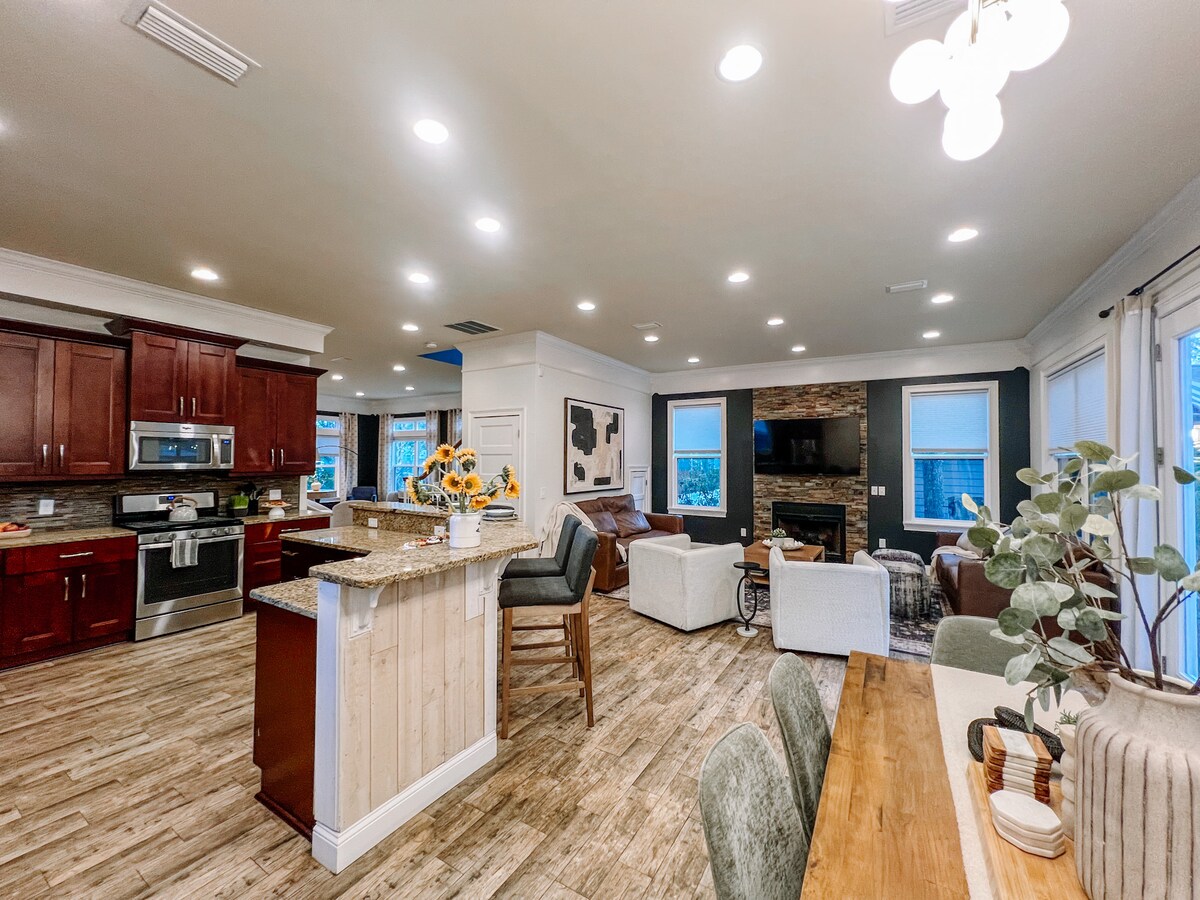 Этот новый строительный дом находится в 5 минутах/1 миле езды от исторического центра города, где вы найдете все веселье, еду и очарование! Откройте для себя ностальгический отдых в этом уникальном тематическом доме, который отражает суть 1920-х/30-хгодов. Просторная открытая планировка идеально подходит для больших групп с большим количеством места для комфортного проживания. НОВАЯ 7-местная гидромассажная ванна, костровая яма и частный огороженный задний двор, пляжные полотенца, игрушки, буги-борды предоставляются! Красивая новая кухня, большой обеденный стол, 2 спальни с кроватью размера King size.