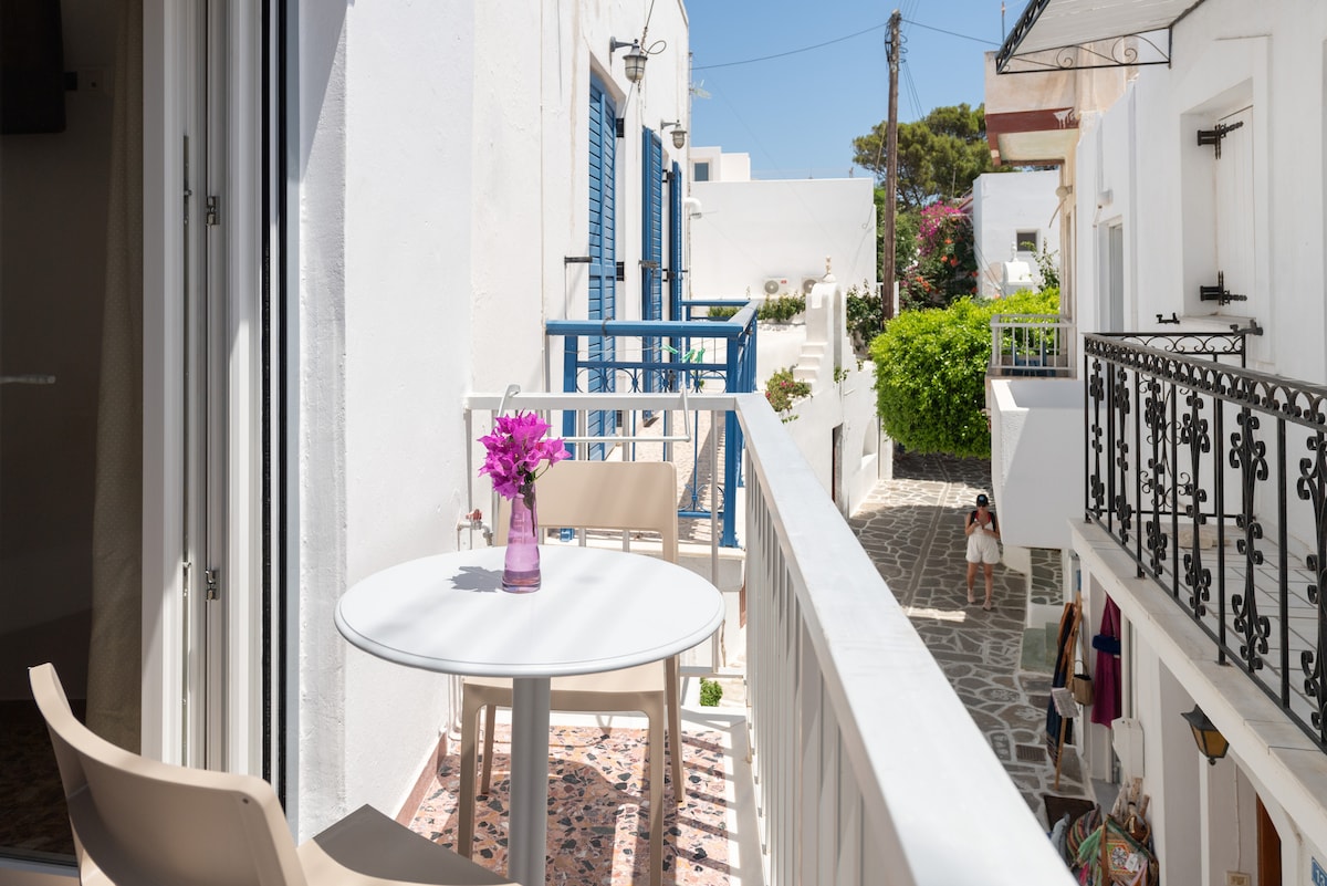 An ideally located 30sqm studio with a unique romantic sunset view, less than 1 km away from the main town of Parikia. A spacious veranda with a marble dining table, a comfy bedroom with a bathroom and a fully equipped kitchen. The studio is only 10 minutes walk from the old market street, and a few minutes drive from the famous beaches of Paroikia.