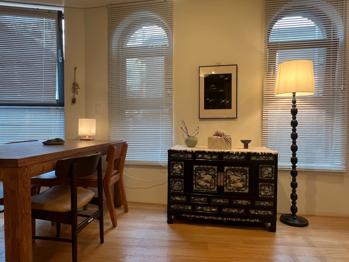 Это частный дом в перламутровом стиле, который гармонично сочетает в себе прекрасные корейские традиции и современный комфорт. Тонкий перламутровый узор, теплое освещение и тихая атмосфера в сочетании делают его идеальным местом для путешествий, отдыха и семейных/дружеских встреч. «Учитывая долгосрочное пребывание, прачечная, кухня и склад полностью оборудованы». 🎨 Концепция — «Традиционная корейская красота в современную эпоху». Перламутровый узор в интерьере, вдохновленный корейской традиционной мебелью. Гармония восточных изгибов и современной мебели Инстаграмное настроение только с фотографиями Уединенная атмосфера гостиничного класса со спокойным дизайнерским освещением. 📍 Лучшее расположение 8 минут ходьбы от станции метро KTX Yongsan на линии 1 Станция Хёчан-парк, линия 6, 10 минут пешком. Доступно от станции Синёнсан. Расположен в тихом жилом районе, безопасно и спокойно даже ночью 3 минуты пешком от рынка Йонмун — лучшее место для местной еды, закусок и экскурсий по рынку Отличный доступ к Намсану, Национальному музею Кореи, парку Йонсан, Намсану, Хондэ, Итэвону. 🏠 Настройка объявления ✔ Дом целиком · Максимум 6 человек Предоставьте личное пространство