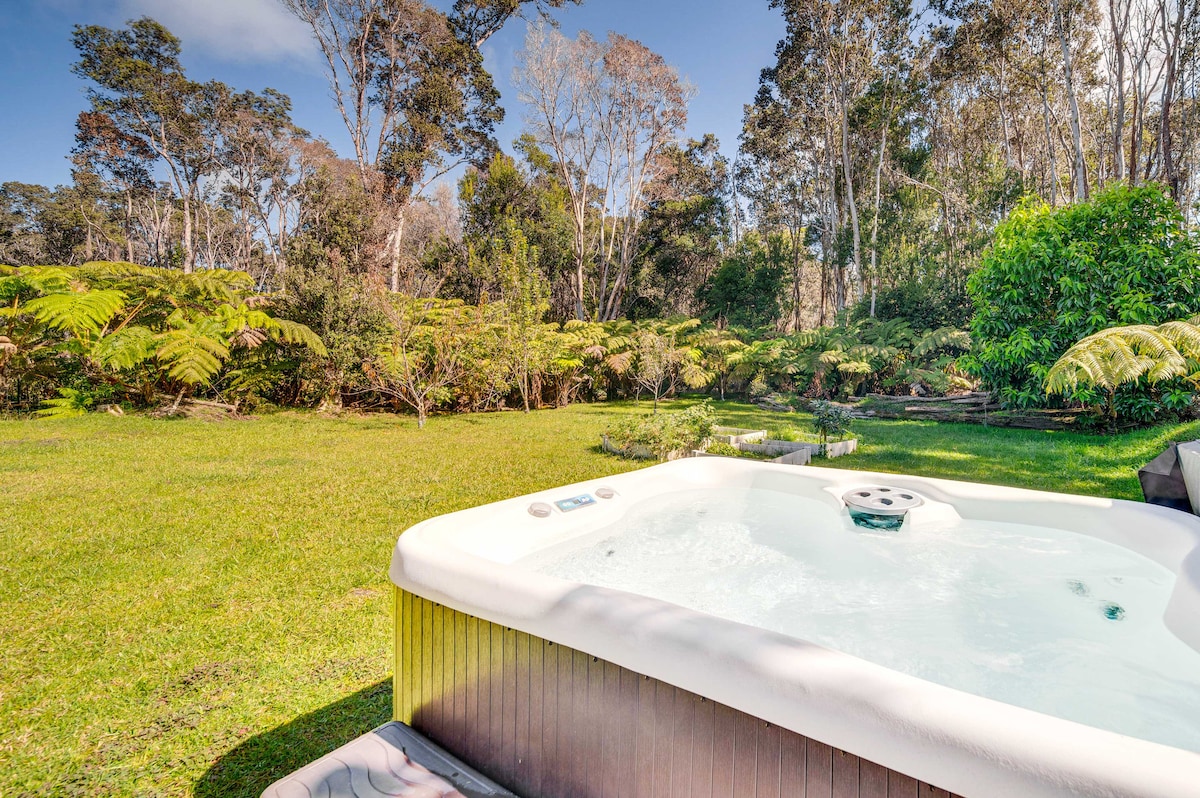Это тихое горное убежище предлагает мир и спокойствие в сельской местности недалеко от Гавайского вулканического национального парка. В частном доме есть крытые веранды с обеденными зонами, зонами отдыха и местом для костра. В интерьере царит уникальная гавайская атмосфера с изысканным декором. Панорамные окна в задней части дома открывают вид на тропический лес. Полноценная профессиональная кухня — идеальное место для приготовления еды для всей семьи.