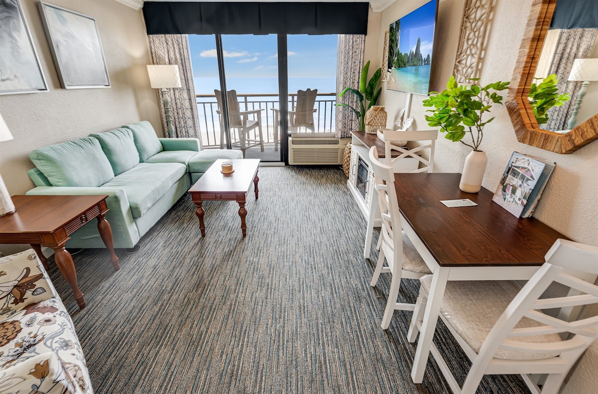 Ocean View | Community Pools & Hot Tub | Free WiFi Experience the ultimate Myrtle Beach getaway from this inviting oceanfront condo! Just steps from the beach, world-class shopping, golf courses, and family-friendly attractions, this vacation rental puts everything at your fingertips. With direct access to the Myrtle Beach Boardwalk and Promenade, exploring the area has never been easier.Starbucks on site. The condo comfortably sleeps guests with 2 Queen Beds and a sleeper sofa in the living r