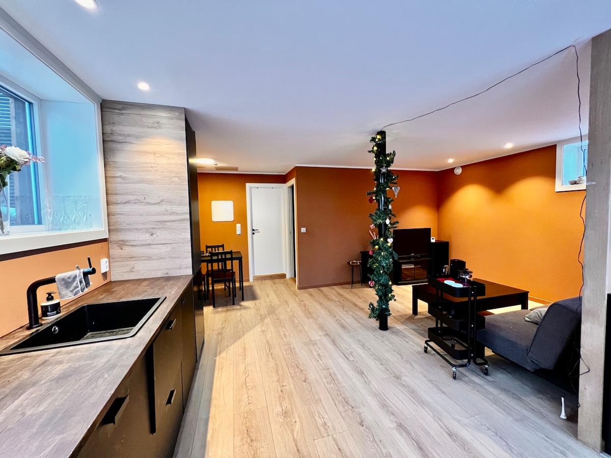 Len deg tilbake og slapp av på dette rolige, elegante stedet. Når du kommer inn døren så er du i stuen. Med privat balkong og peis. En sofa og queen size seng. Ta trappen ned for å komme til kjøkken og bad. Kjøkkenbenken er ganske liten, men den har induksjonstopp og stekeovn. Leiligheten passer for en til to personer som ønsker å være nær turterreng og skiløyper. Fint utgangspunkt for turer i naturen. Samtidig kun 30 minutter fra Oslo sentrum med museer og restauranter.