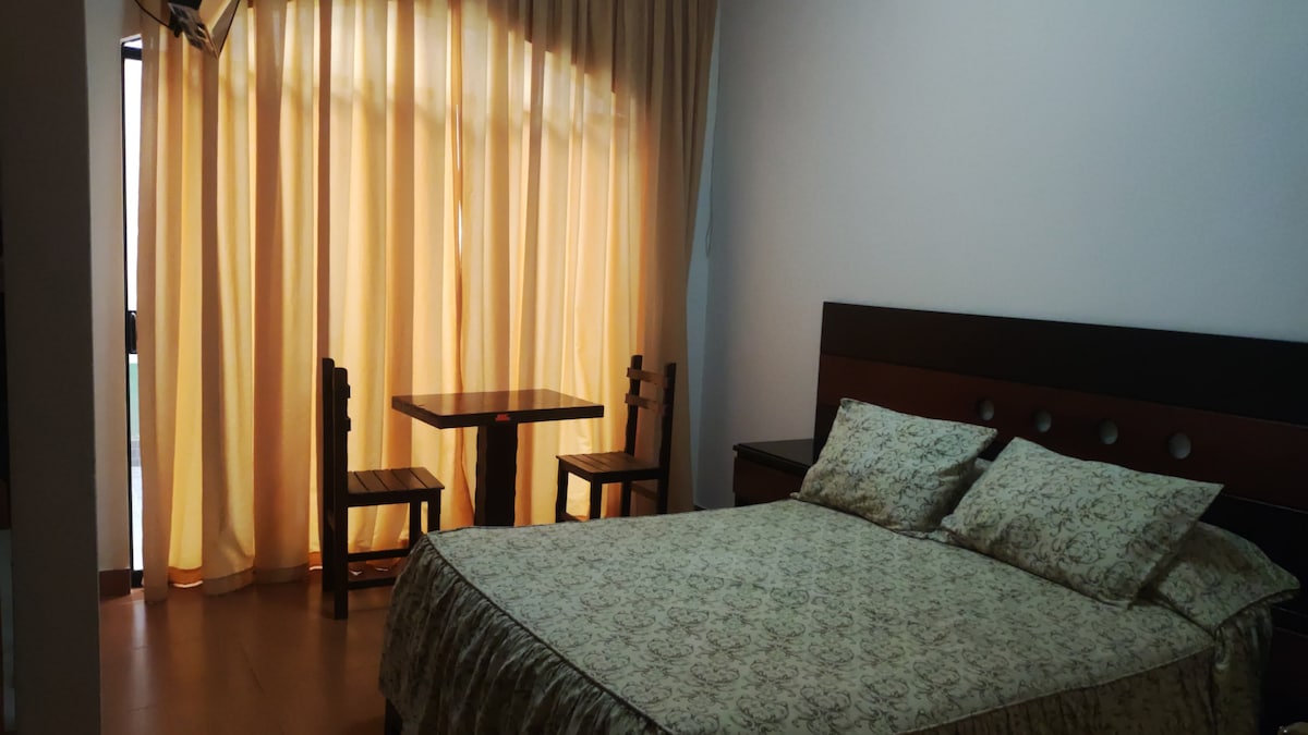 habitación en primer piso, baño privado, cama Queen, frigobar, microondas y hervidor. Espaciosa, zona tranquila, cerca Av. Melgarejo, sede principal del BCP, a tres cuadras Javier Prado (óvalo Huarochiri), estación buses. Desconecta de tus preocupaciones en este espacio tan amplio y sereno. Cuidamos mucho de la tranquilidad, respeto y limpieza del lugar. Uso de lavadoras y secadora (área común) una vez por semana. cocina compartida para estadías largas