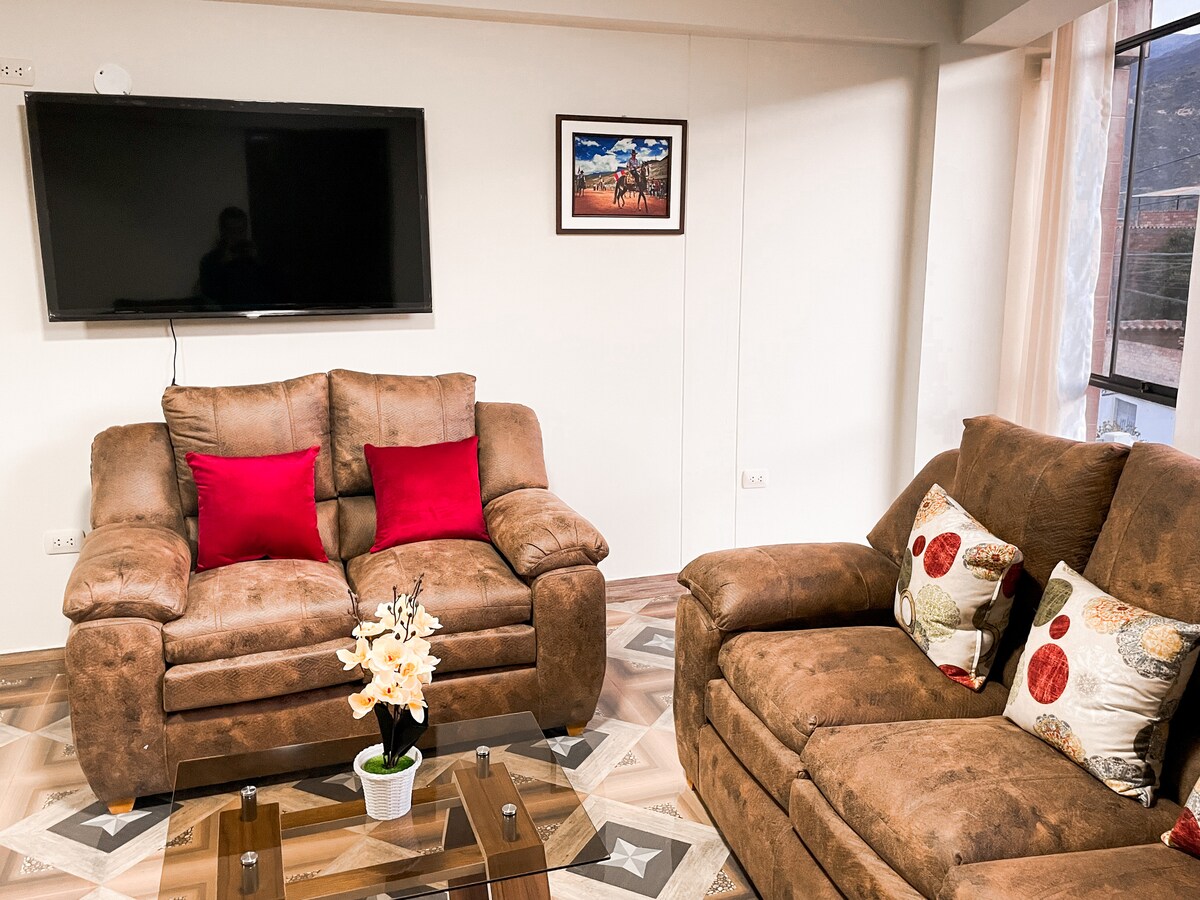 Комфортабельная и современная квартира в 1 ½ квартала от Пласа-де-Армас-де-Карас. Идеально подходит для семей или групп до 4 человек. 4 с половиной кровати: 2 в главной комнате и 1 каюта во второй комнате. Идеально подходит для семей или групп до 4 человек. В распоряжении гостей телевизор с кабельными каналами, Wi-Fi, горячая вода, оборудованная кухня, холодильник, микроволновая печь и чайник. Расположение на 2-м этаже, недалеко от ресторанов, рынков и туристических агентств в Уайлас-Кальехоне.