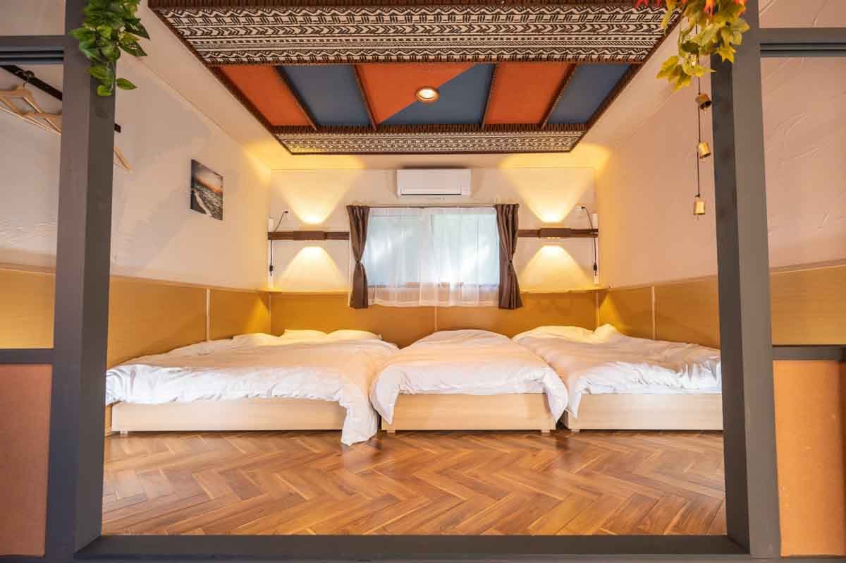 a spacious layout w a large terrace, kitchen, living room, & dining area. The loft bedroom has a double bed & a semi-double bed, while the livingroom also has a semi-double bed. Families can comfortably accommodate children in the loft, while adults can use the living room bed. Surfers will appreciate amenities like the surfboard rack, outdoor shower, & sink. optional BBQ facilities. Enjoy various activities from lively terrace gatherings to movie nights w 100-inch projector.