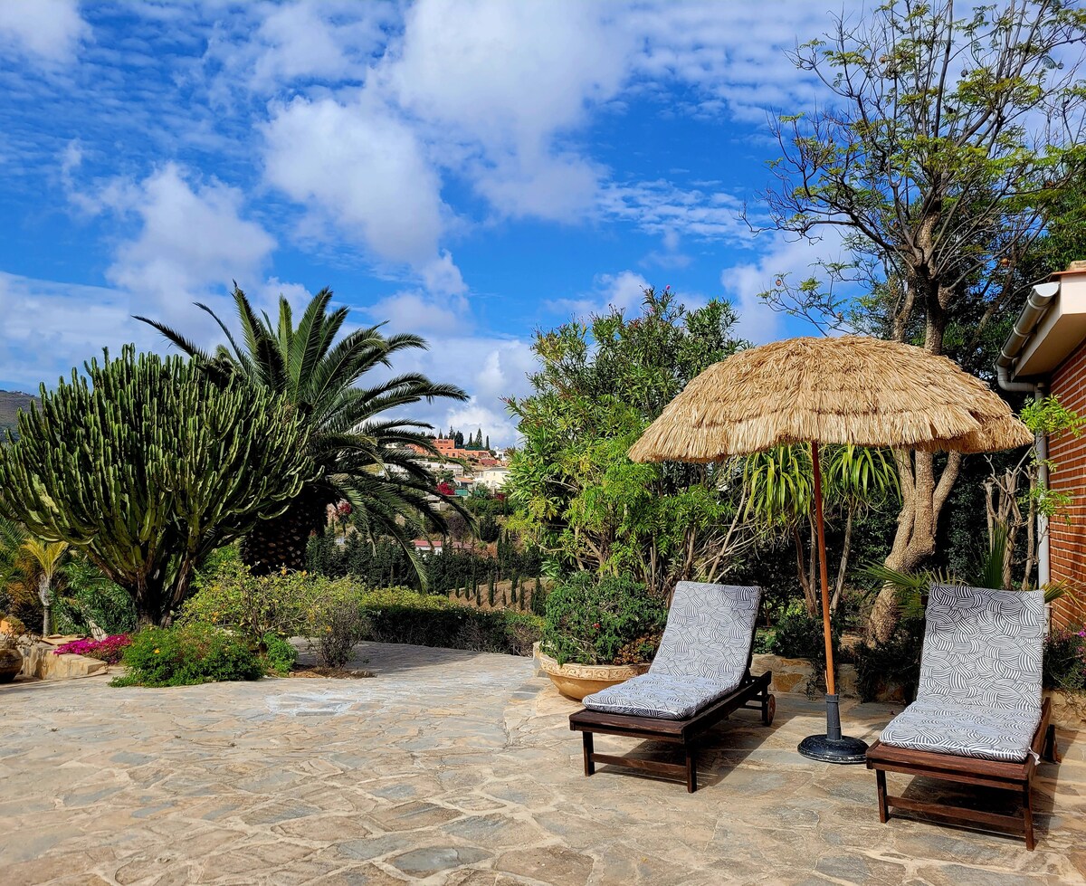 Unique 1 bedroom clocktower Casita on a beautiful Finca only minutes away from the beach. The stylish casita has a double bedroom and a living/dining room with a sofa bed. There's a huge terrace with wonderful views of the surrounding countryside and even a glimpse of the sea. The location is very peaceful and yet it's only a 20 minute walk (uphill on the way back) or less than 5 minute drive to the beach and town- Relax in the hammock or on the sun loungers and cool off in the small pool
