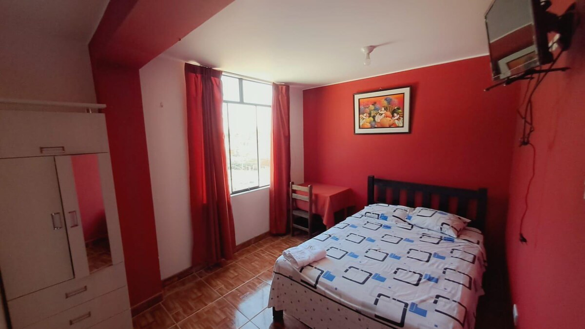 Уютная комната с отдельным входом в Наска, идеально подходит для пар, небольших групп и небольших семей. Современное жилье расположено на первом этаже. К услугам гостей двуспальная кровать, односпальная кровать, полностью оборудованная ванная комната с горячей водой, небольшая гостиная, барный холодильник, вентилятор и Wi-Fi. К услугам гостей кабельное телевидение, доступ к общей кухне и прачечной; просторная парковка. Жилье расположено в безопасном районе, всего в 15 минутах ходьбы от главной площади. Идеальный выбор для комфортного и расслабляющего отдыха в городе.