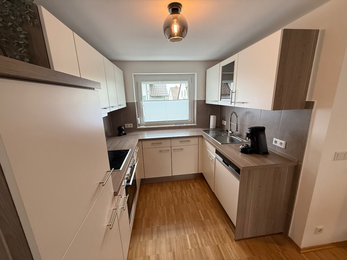 2-комнатные апартаменты с балконом (гостиная и обеденный стол), гостиной, столовой и кухней, а также душем/туалетом расположены на первом этаже. Спальня и просторная ванная комната с большим душем на чердаке. Диван в гостиной можно превратить в двуспальную кровать. В квартире есть все необходимое для повседневного использования. Очень центральное расположение, магазины в 500 м, центр Кельхайма находится примерно в 1,5 км.