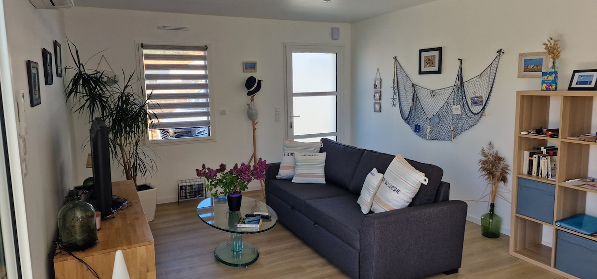 Аренда дома с видом на море. Дом новый (август 2020 года) и находится в 50 метрах от пляжа. У нас 3 спальни — 1: спальня с двуспальной кроватью; — 2: спальня с 2 односпальными кроватями. — 3: спальня с 2 двухъярусными кроватями. В гостиной есть двуспальный диван-кровать. В доме 2 ванные комнаты: одна с ванной, другая с душевой кабиной. Есть 2 туалета. Большая гостиная с центральным островом для кухни. Сад и терраса выходят на юг. Газовый гриль Weber с планчей.