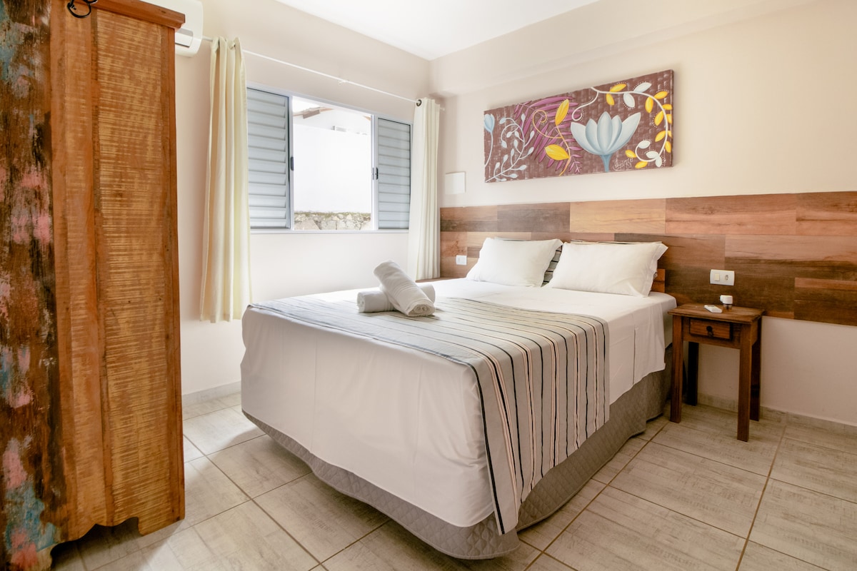 O Quarto Luxo é equipado com cama Queen Size, Smart TV 32″, ar-condicionado, frigobar, banheiro privativo, amenities e roupa de cama e banho. Acomoda 3 pessoas. Os quartos possuem rede de descanso e foram decorados com muito capricho para trazer todo aconchego.