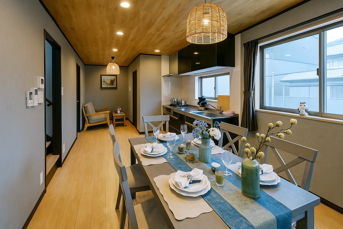 3 минуты ходьбы до станции метро Shoji. 10–15 минут на поезде до Намбы, Дотонбори, Синсайбаси, замка Осаки. 1 час от аэропорта Кансай с 1 пересадкой. Тихий жилой район недалеко от центра города. Гараж подходит для минивэна. Отлично подходит для семей или групп. Дом площадью 91 кв. м для 8 гостей. Частный, просторный и расслабляющий дом. Японско-западный стиль с гостиной, большой ванной, кухней и прачечной. 3 минуты до круглосуточного магазина. 5–6 минут до супермаркета, аптеки, торговой улицы и ресторанов. Почувствуйте себя жителем Осаки!