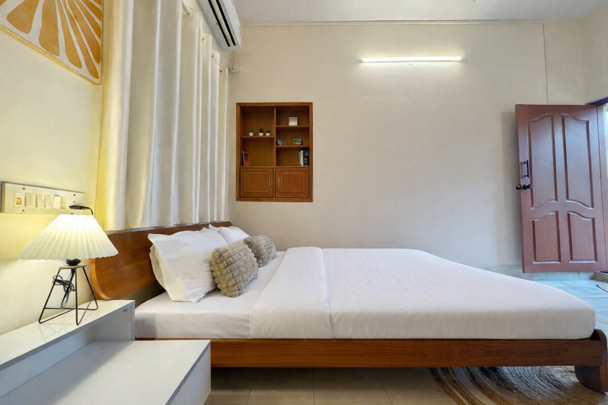Просторный дизайнерский люкс площадью 600 квадратных футов с 1 спальней и балконом | Высокоскоростной Wi-Fi по оптоволоконному кабелю и Smart TV с потоковыми платформами, рабочий/обеденный стол, круглосуточное резервное питание для бесперебойной работы и комфорта | Роскошная кровать размера King size и ортопедический матрас, деревянные шкафы для хранения | полностью оборудованная мини-кухня | диван-кровать в гостиной, максимальная вместимость 4 человека | доступ к лифту, профессиональная уборка и доступ к платной прачечной на территории для длительного проживания| Расположен в центре Бангалора | LGBTQIA++ Affirmative