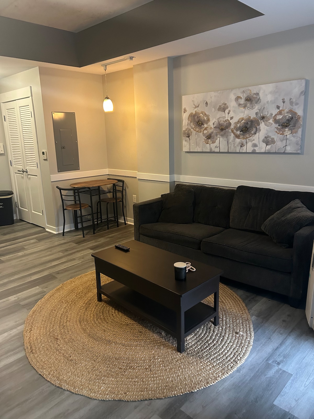 Расслабьтесь и остановитесь в этой модной стильной квартире верхнего уровня. В этой квартире есть большая спальня с прачечной в номере и просторная ванная комната с огромной ванной и душем (струи не работают). Жилое пространство также очень просторное с открытой планировкой в большую обеденную зону. Наш диван-кровать также является полноценной кроватью! Вы можете поужинать с полностью укомплектованной кухней и развлечься с друзьями. Мы находимся всего в нескольких минутах от центра города, если посещение ресторана кажется более желательным!